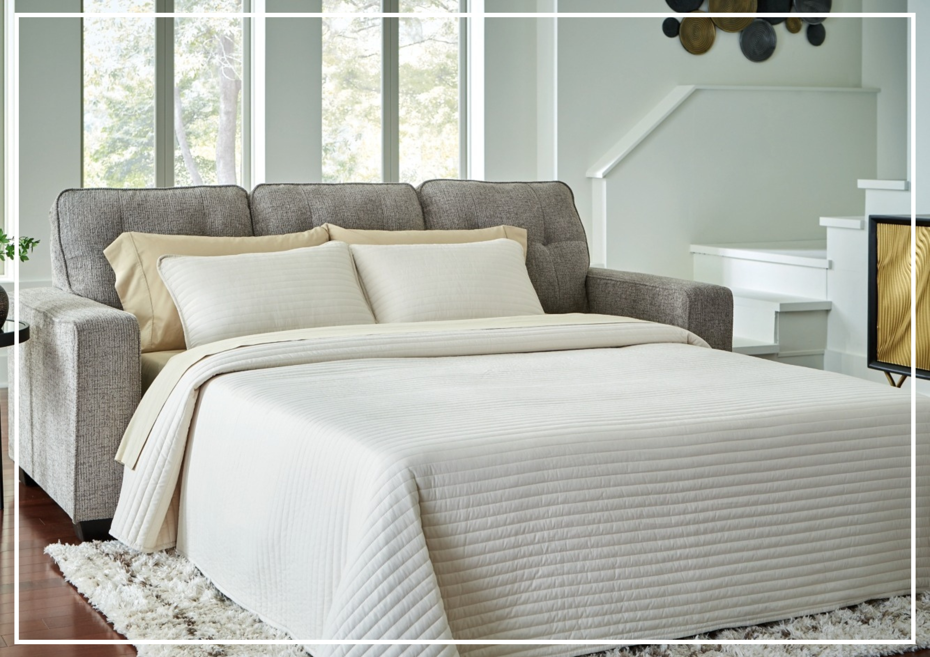 Hidden within the sofa is a queen-size sleeper, making the Lorrine an ideal solution for overnight guests. The smooth bi-fold mechanism reveals a memory foam mattress supported by a durable steel frame, ensuring reliable stability and comfort. Wrapped in breathable damask ticking, the mattress promotes airflow for a cooler, more restful night’s sleep. When not in use, the sleeper folds away seamlessly, maintaining a clean, uncluttered look. Finished with exposed faux wood-grain feet, this fabric sofa sleeper offers versatile style, smart functionality, and dependable comfort in one elegant design.